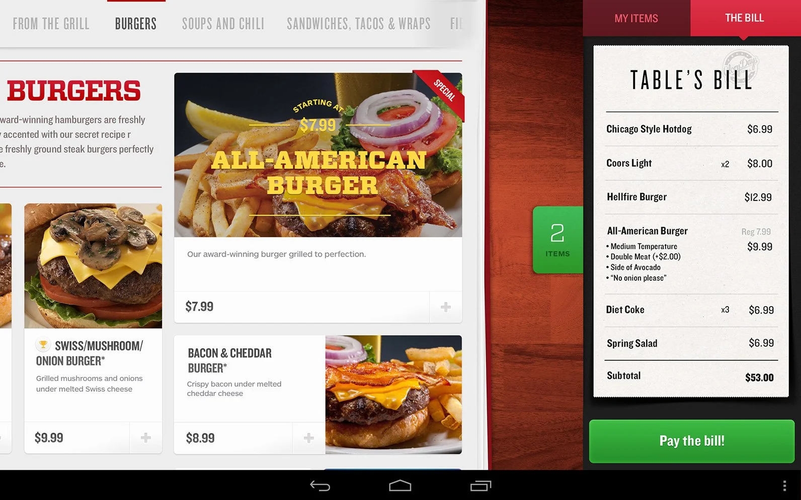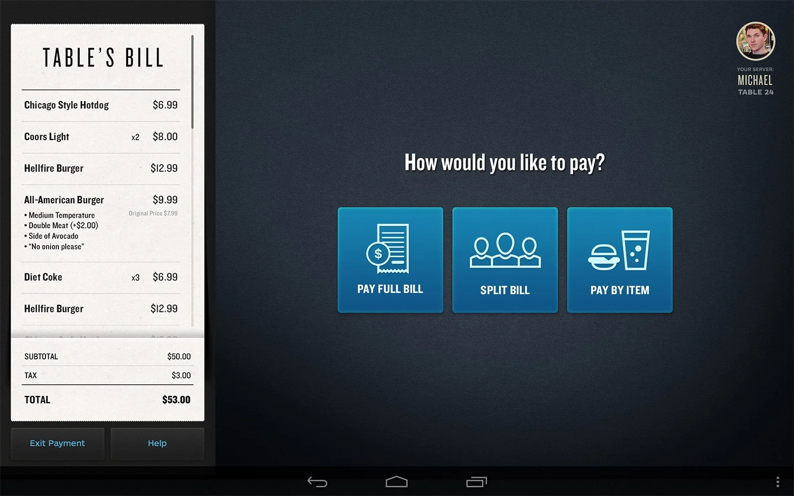 Customers can pay the bill on their schedule, ability to pay bills upon the desire to leave, and different ways to pay bills: Pay in full as one payment, split, or pay by item.