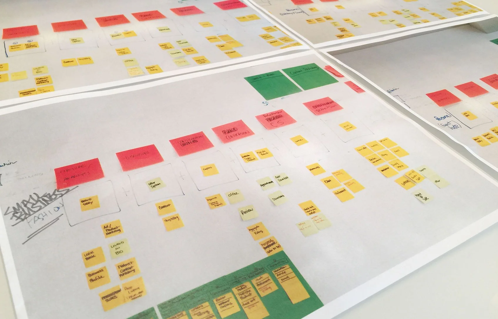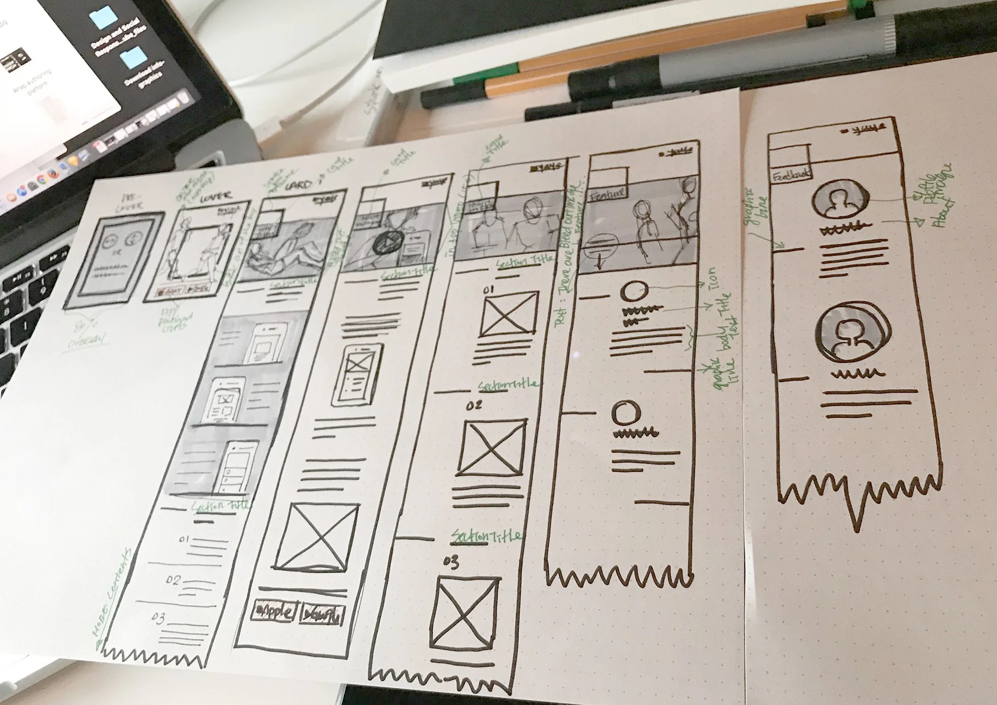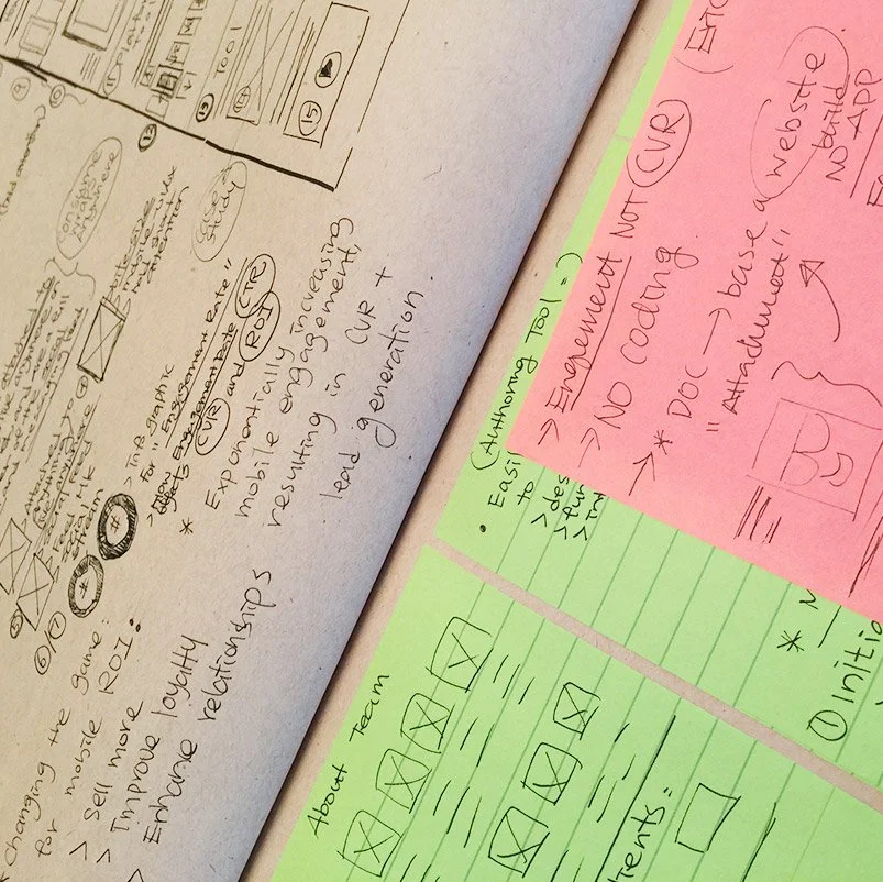 This is the early stage of the design process: researching, taking notes, understanding competitors, and sketching rough mock-ups. No idea is a bad idea at this stage. Thinking outside of the box, pushing boundaries, and being creative.
